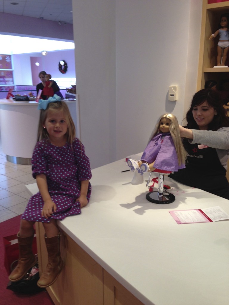 Mama and Papa decided a couple months back that they wanted to take the grandkids on a trip to the Gaylord Texan right after Thanksgiving. The Gaylord goes above and beyond decorating for Christmas and in one of their conference centers they have Madagascar Ice set up. Each year is a different theme but with both of our kids liking the Madagascar characters it was perfect! Friday morning Mama and Papa picked up the big girls and they started their trip to Dallas about 8:00. My mom had made reservations at the American girl store to get their dolls hair done and have lunch. They had a great time and Hadley and Peyton's dolls got matching hair styles.
