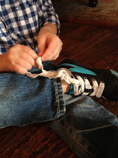 Ever since Hadley learned how to tie her own shoes, Hudson has been itching to learn as well. He will entertain himself for the longest time as he tries and tries to get them tied. It actually turns into a bunch of knots but he is still so pleased with himself in the end.